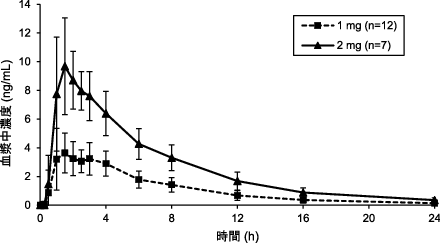 健康成人(19例)にオシロドロスタット1及び2mgを単回経口投与したとき、投与1.5時間後(中央値)に最高血漿中濃度(Cmax)に到達した。消失半減期は約4.8時間であった1)。