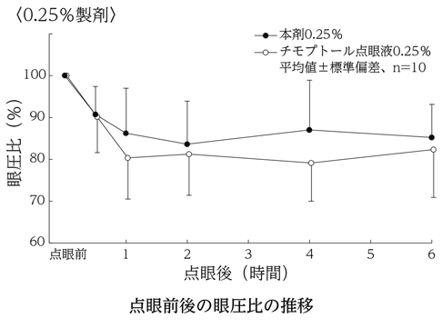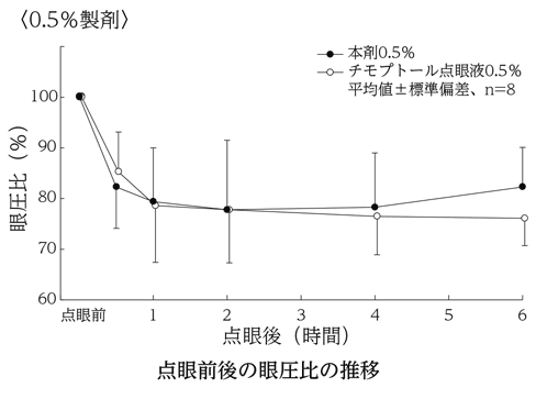 原発開放隅角緑内障及び高眼圧症患者を対象に本剤又はチモプトール点眼液を1滴片眼に点眼し、眼圧を測定した。点眼前後の眼圧比(点眼前の眼圧に対する点眼後の眼圧)を同等性の指標として各時点の眼圧比をt検定にて解析した結果、有意な差は認められず、両製剤の生物学的同等性が確認された13),14)。