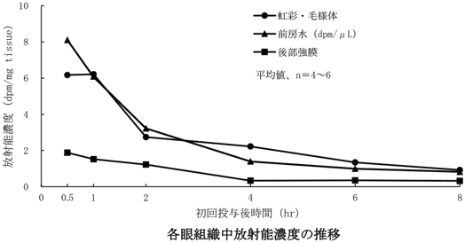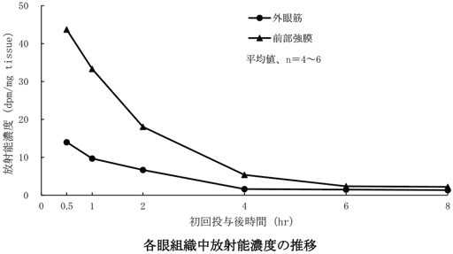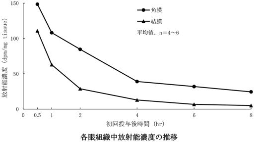 ウサギの両眼に0.1%14C-プラノプロフェン点眼液を1回0.01mL、3分間隔で4回点眼したとき、各眼組織中放射能濃度の推移は図のとおりであった。点眼後30分の放射能濃度は、角膜、結膜、前部強膜、外眼筋、前房水、虹彩・毛様体、後部強膜の順に高かった。網膜・脈絡膜、水晶体、血液及び肝臓中放射能濃度は低く、硝子体にはほとんど認められなかった2)。