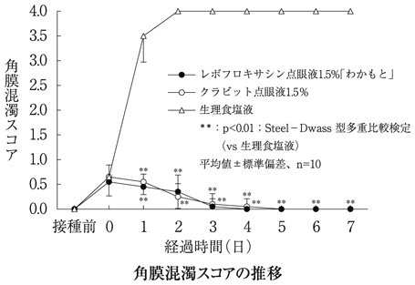 ウサギ緑膿菌角膜感染症モデルを用い、本剤、クラビット点眼液1.5%及び陰性対照として生理食塩液を菌接種6時間後から1日6回、3日間点眼し、角膜混濁スコアをSteel-Dwass型多重比較検定にて比較した。その結果、本剤及びクラビット点眼液1.5%は生理食塩液と比較して角膜混濁スコアの増加を有意に抑制し、また、本剤とクラビット点眼液1.5%間に有意な差は認められなかったことから、両剤の生物学的同等性が確認された15)。