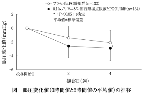 プロスタグランジン関連薬(PG)の治療期間が90日以上で、眼圧値が18.0mmHg以上の原発開放隅角緑内障(広義)又は高眼圧症患者を対象に、0.1%ブリモニジン酒石酸塩点眼液又はプラセボを両眼に1回1滴、1日2回、PGと併用して4週間点眼した無作為化二重遮蔽並行群間比較試験において、優越性を検証した。その結果、眼圧変化値(0時間値と2時間値の平均値)は図のとおりであり、投与4週後の眼圧変化値は両群間で統計学的に有意な差を示し、プラセボに対する優越性が検証された(差の平均値:-0.7mmHg、95%両側信頼区間:-1.2~-0.3mmHg、P=0.0010)。