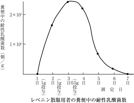 健常人にレベニン散を3日間経口投与し、糞便中の耐性乳酸菌数を測定した結果、耐性乳酸菌は投与後2日目より糞便中に認められ、耐性乳酸菌の菌数は3日目に最大となり、7日目ではほとんど認められなかった1)。