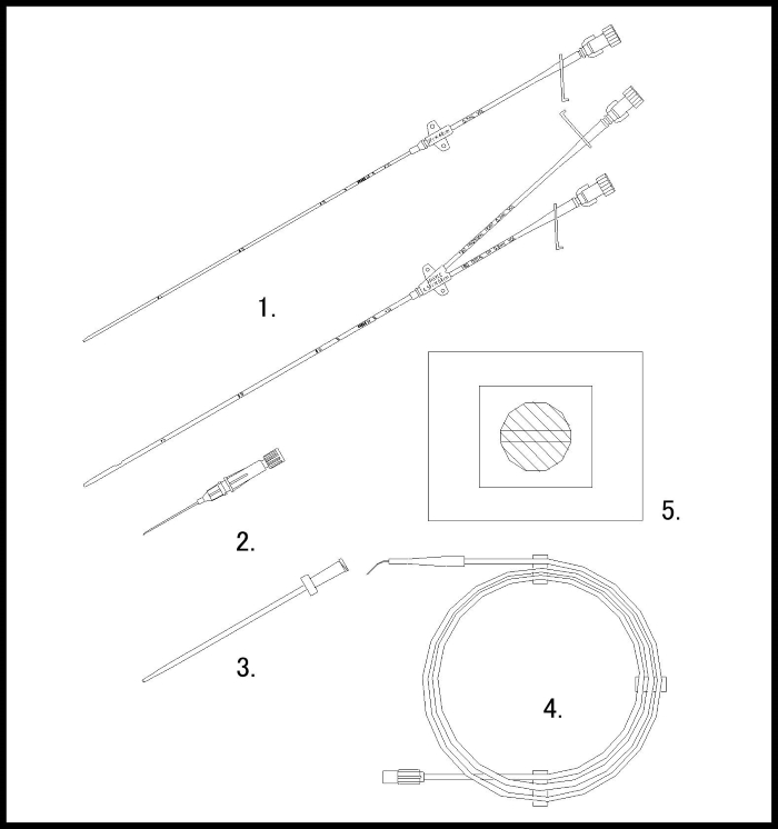 〈構成〉1.カテーテル本体(クランプ付) 1 本2.プラスチックカニューラ針 1 本3.ダイレータ 1 本4.ガイドワイヤ 1 本*5.ドレープ 1 枚