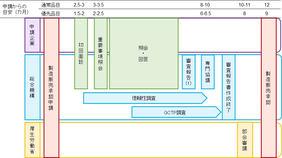 以下のタイムラインは、審査の経験上、特段の問題がなかった場合について、申請受付から総審査期間の目標(通常品目:12カ月、優先品目:9カ月)を達成するよう努力するため、各審査イベントの申請時点からの目安時期を示したものです。